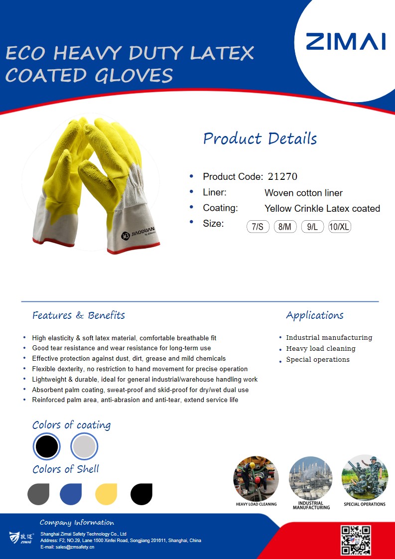 21270 ECO Heavy Duty Latex Coated Gloves Product No.: 21270 Yellow crinkle latex coated Open back Woven cotton liner Safety cuff Size available: 7/S-10/XL Send Inquiry Live Chat Product Details Data Sheet ECO Heavy Duty Latex Coated Gloves Yellow crinkle latex coated Open back Woven cotton liner Safety cuff Size available: 7/S-10/XL Tags:ECO Heavy Duty Latex Coated GlovesSafety CuffWoven cotton liner Share: FacebookTwitterLinkedInWhatsApp Prev: 21250 Heavy Duty Latex Coated Gloves Next: 21300 Smooth Latex Gauntlet Gloves Related Products 21290 Latex Gauntlet Gloves