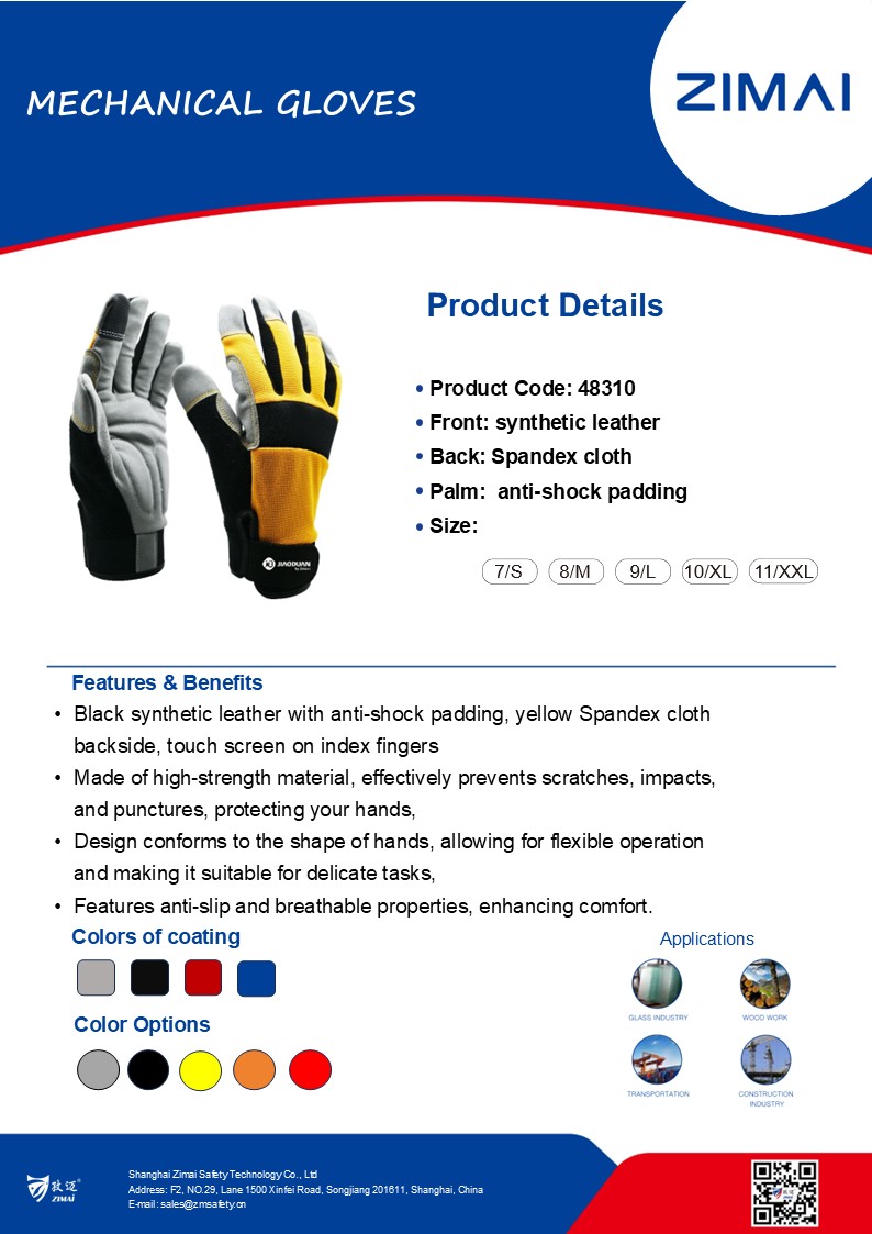 48310 Mechanical Gloves Product No.: 48310 Black synthetic leather with anti-shock padding Yellow spandex cloth back Verlcro wrist closure Touch screen on index fingertip Size: S/7-10/XL Send Inquiry Live Chat Product Details Data Sheet Mechanical Gloves Black synthetic leather with anti-shock padding Yellow spandex cloth back Verlcro wrist closure Touch screen on index fingertip Size: S/7-10/XL Tags:GlovesGrey GlovesMechanical Gloves Share: FacebookTwitterLinkedInWhatsApp Prev: 48300 Anti -Impact Mechanical Gloves Next: 48320 Mechanical Gloves Related Products 48424 Mechanical Gloves