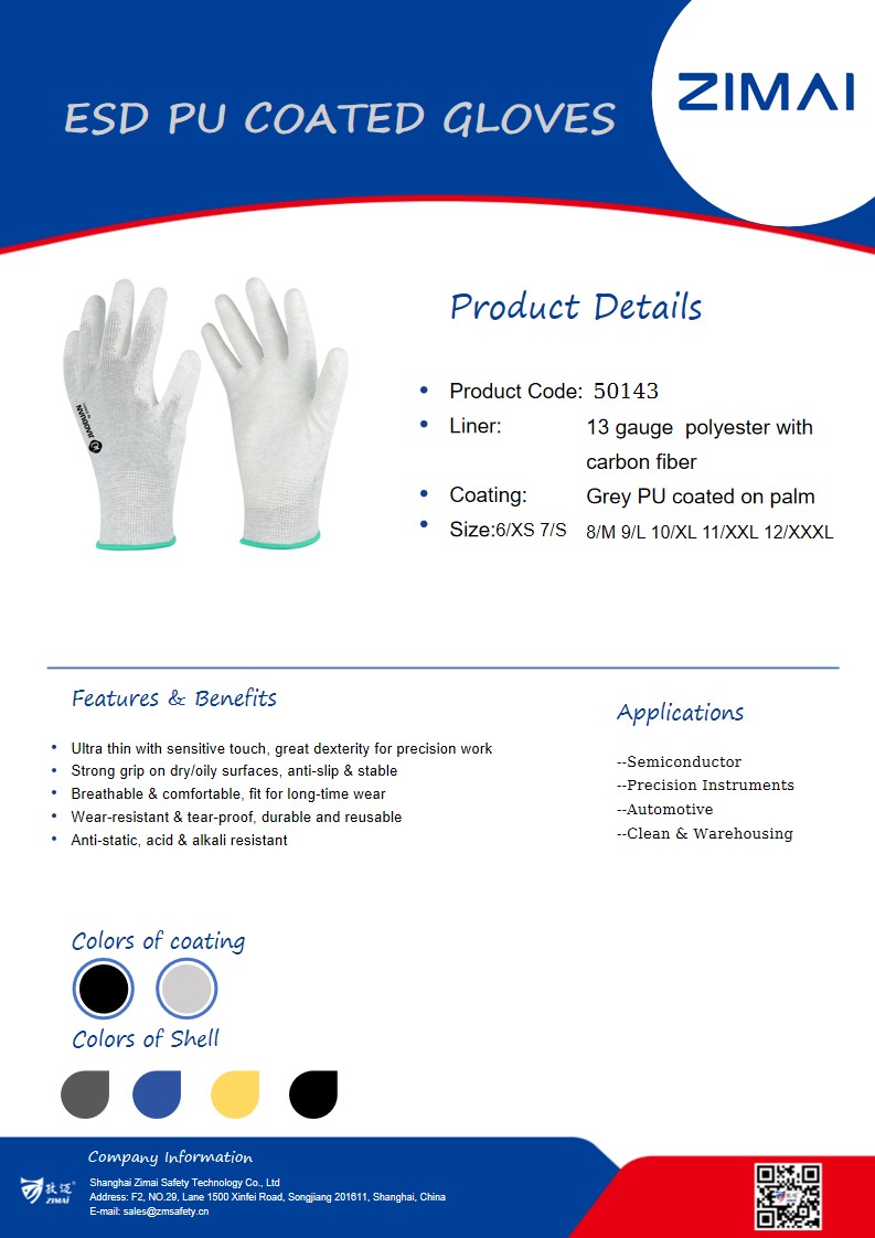 50143 ESD PU Coated Gloves Product No.: 50143 13 gauge polyester with carbon fiber seamless liner Grey PU coated on palm Size available:6/XS-12/XXXL Send Inquiry Live Chat Product Details Data Sheet ESD PU Coated Gloves 13 gauge polyester with carbon fiber seamless liner Grey PU coated on palm Size available:6/XS-12/XXXL Tags:13 gaugeESD PU Coated GlovesGrey Gloves Share: FacebookTwitterLinkedInWhatsApp Prev: 50108 Touch Screen PU Coated Gloves Next: 51003 Fingertip Coated PU Gloves Related Products 51033 Fingertip Coated ESD PU Gloves