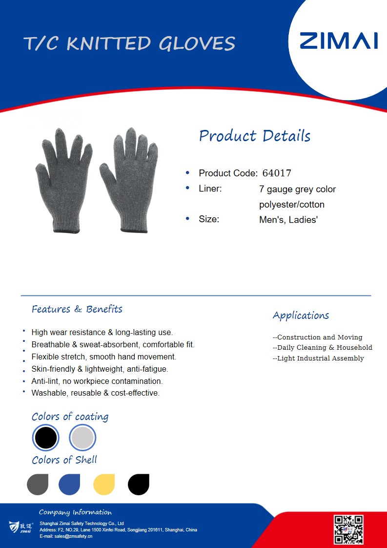 7 gauge grey color polyester/cotton seamless knitted gloves
