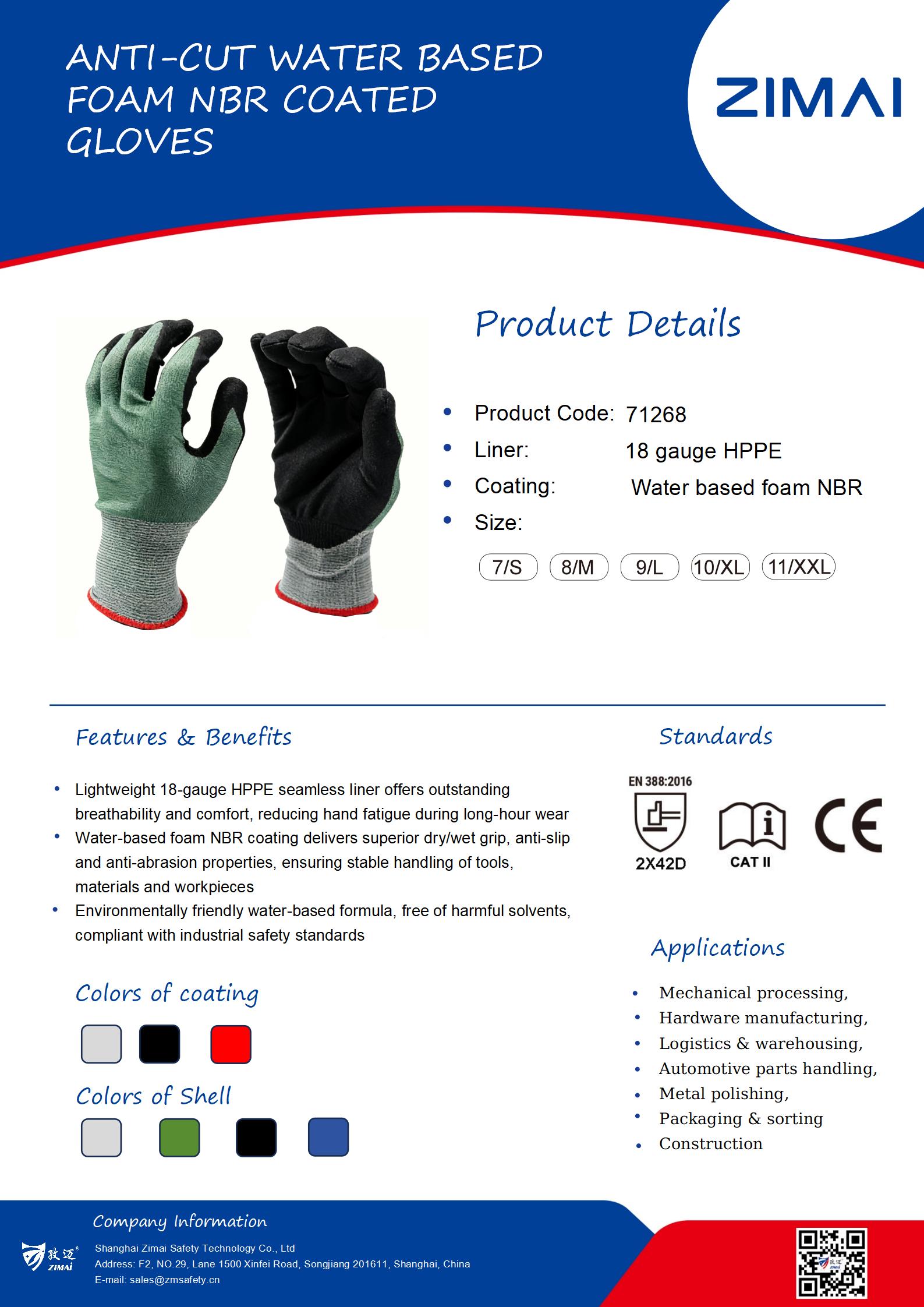 71268 Anti-cut Water based foam NBR coated Gloves Product Code: 71268 18 gauge green HPPE seamless liner Black water based foam nitrile coated on palm Cut resistant level: D Size available: 7/S-11/XXL Send Inquiry Live Chat Product Details Date sheet Anti-cut Water based foam NBR coated Gloves 18 gauge green HPPE seamless liner Black water based foam nitrile coated on palm Cut resistant level: D Size available: 7/S-11/XXL Share: FacebookTwitterLinkedInWhatsApp Related Products