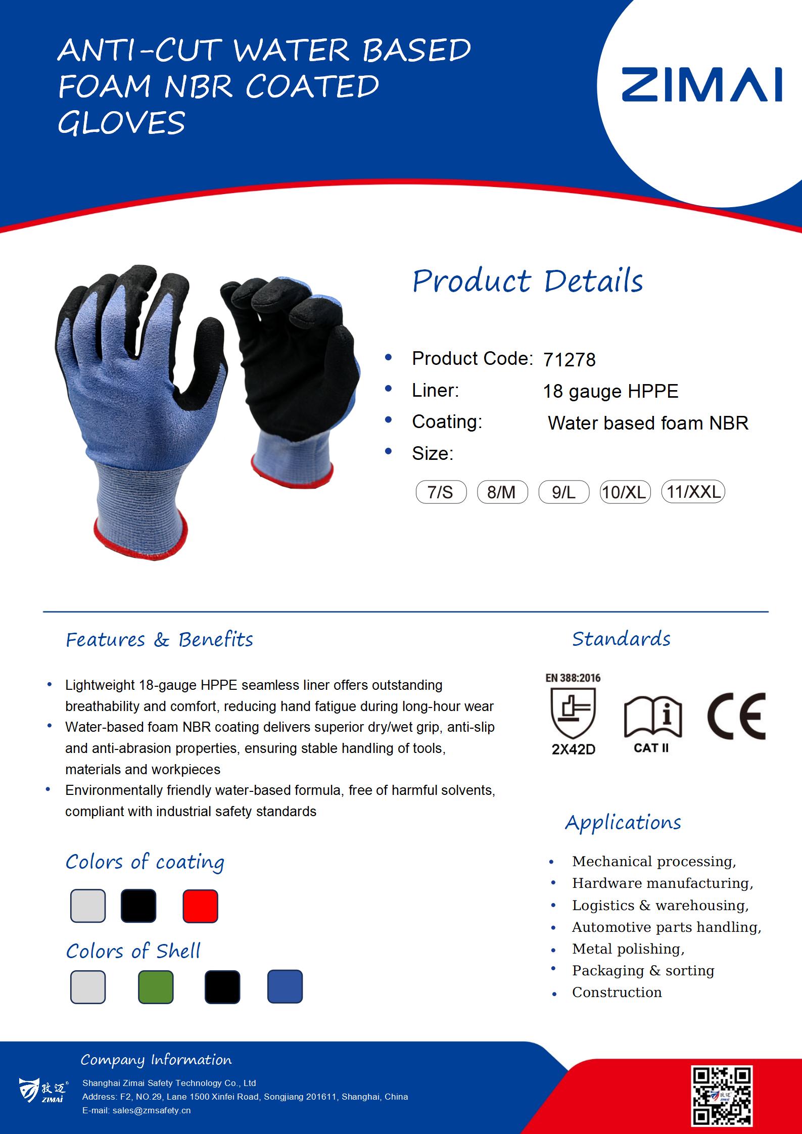 71278 Anti-cut Water based foam NBR coated Gloves Product Code: 71278 18 gauge blue HPPE seamless liner Black water based foam nitrile coated on palm Cut resistant level: D Size available: 7/S-11/XXL Send Inquiry Live Chat Product Details Date sheet Anti-cut Water based foam NBR coated Gloves 18 gauge blue HPPE seamless liner Black water based foam nitrile coated on palm Cut resistant level: D Size available: 7/S-11/XXL Share: FacebookTwitterLinkedInWhatsApp Related Products