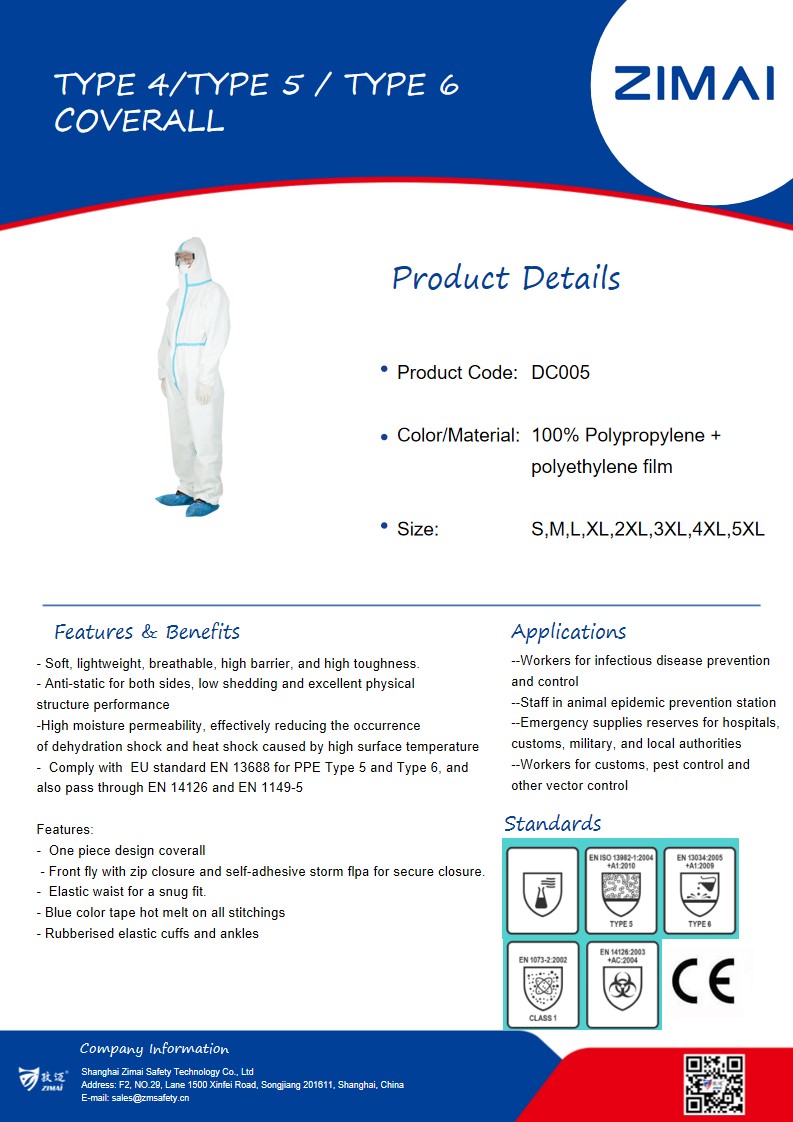 DC005 Type 4/Type 5/Type 6 Coverall Product No.: DC005 Type4/Type 5/Type 6 microporous coverall Heat sealed tape seam Material: SF Size: S-5XL CE Approved Send Inquiry Live Chat Product Details Date Sheet Type 4/Type 5/Type 6 Coverall Type4/Type 5/Type 6 microporous coverall Heat sealed tape seam Material: SF Size: S-5XL CE Approved Tags:Coverall Share: FacebookTwitterLinkedInWhatsApp Prev: DC004 Type 5/Type 6 Coverall Next: DC006 Type 3/Type 4/Type 5/Type 6 Coverall Related Products TC300 Type 3B/4B/5B/6B Coverall