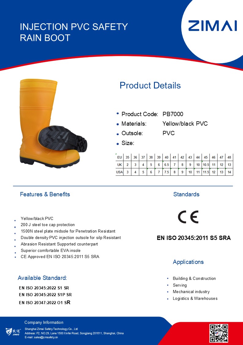 PB7000 Injection PVC Safety Rain Boots Product No.: PB7000 Yellow/black color PVC material Steel toe cap, steel plate midsole Size available: 37-47 EN ISO 20345:2011 S5 SRA Send Inquiry Live Chat Product Details Date Sheet Injection PVC Safety Rain Boots Yellow/black color PVC material Steel toe cap, steel plate midsole Size available: 37-47 EN ISO 20345:2011 S5 SRA Tags:PVC Safety Rain BootsRain BootsSafety Rain Boots Share: FacebookTwitterLinkedInWhatsApp Next: PB7100 Injection PVC Safety Rain Boots Related Products PB7600 Injection Safety Rain Boots