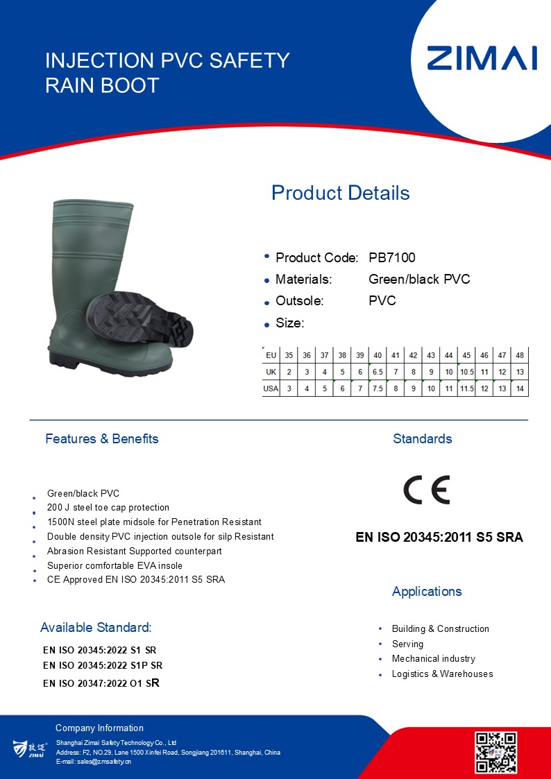 PB7100 Injection PVC Safety Rain Boots Product No.: PB7100 Green/black color PVC material Steel toe cap, steel plate midsole Size available: 37-47 EN ISO 20345:2011 S5 SRA Send Inquiry Live Chat Product Details Date Sheet Injection PVC Safety Rain Boots Green/black color PVC material Steel toe cap, steel plate midsole Size available: 37-47 EN ISO 20345:2011 S5 SRA Tags:PVC Rain BootsPVC Safety Rain BootsSafety Rain Boots Share: FacebookTwitterLinkedInWhatsApp Prev: PB7000 Injection PVC Safety Rain Boots Next: PB7200 Injection PVC Safety Rain Boots Related Products PB7600 Injection Safety Rain Boots