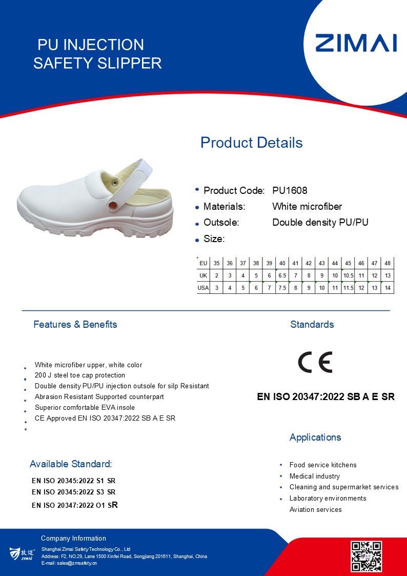 PU1608 PU Injection Safety Slipper Product No.: PU1608 White microfiber upper Steel toe cap, Anti-static Double density PU/PU outsole. Size: 36-48 EN ISO 20347:2022 SB A E SR Send Inquiry Live Chat Product Details Date Sheet PU Injection Safety Slipper White microfiber upper Steel toe cap, Anti-static Double density PU/PU outsole. Size: 36-48 EN ISO 20347:2022 SB A E SR Tags:PUsafety shoesSafety Slipper Share: FacebookTwitterLinkedInWhatsApp Prev: PU1607 PU Injection Occupational Slipper Next: PU1800 PU Injection Safety Boots Related Products MF4902 Metal Free PU Injection High Cut Safety Shoes